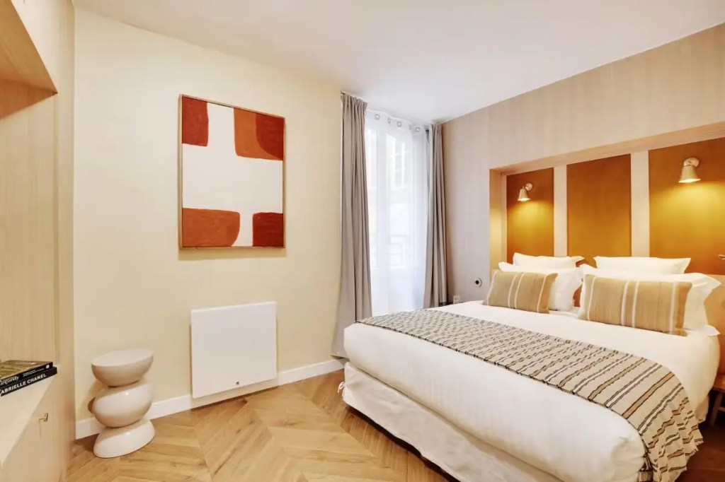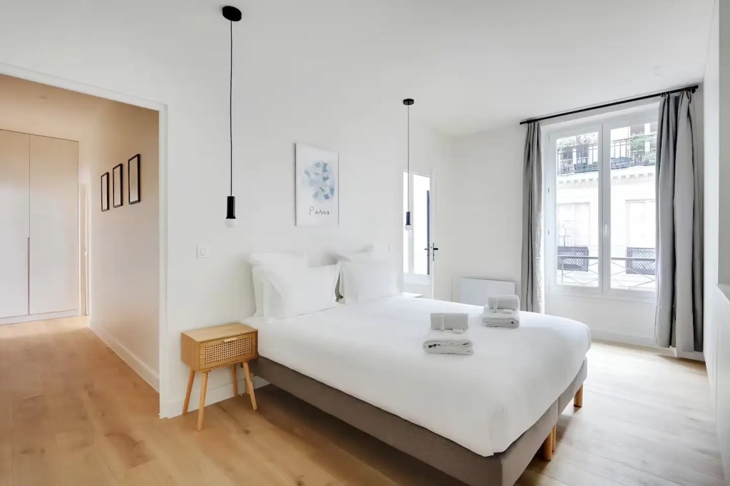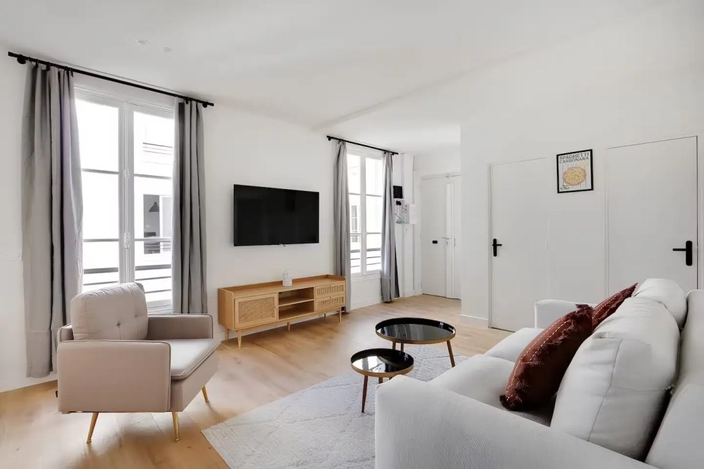 Nestled between Opéra and Grands Boulevards, this minimalist apartment is an ideal base for friends or a small family. Surrounded by cafes, bistros, and bars, with the city’s top attractions just a short Metro ride away, it offers a prime location. The spacious interior features uncluttered bedrooms with en-suite bathrooms for added comfort, while the living area includes a sofa bed for extra guests. Plus, you’ll enjoy glimpses of the Sacré-Cœur from the bedroom windows—a perfect retreat after a day of exploring.