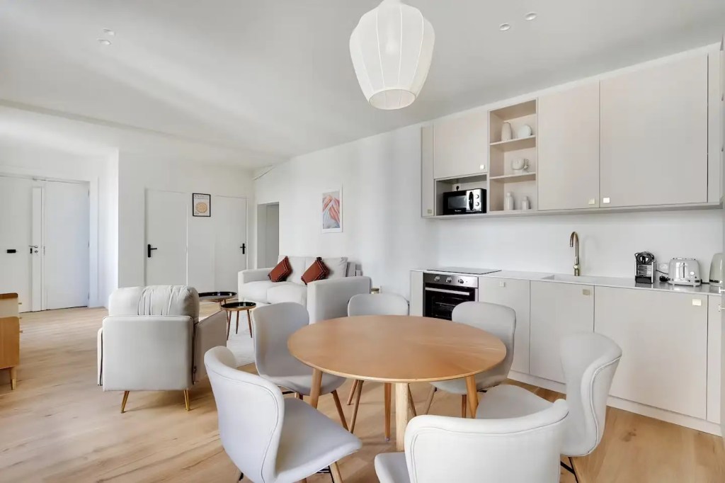 This elegant Paris apartment is ideal for culture lovers, located near theaters, the Palais Royal, Galeries Lafayette, and boutique shopping. The open-plan living area feels inviting, with a well-equipped kitchen and views of classic Parisian architecture. Highlights include a main bedroom with a luxurious en-suite claw-footed bath and several bedrooms with work-friendly desks. Perfect for friends or family seeking comfort and convenience in the heart of the city.